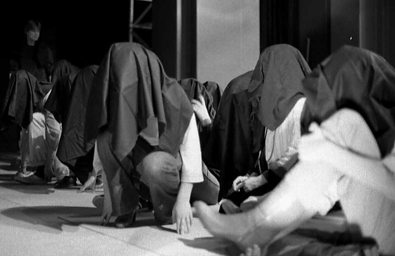 scène XII, na de jodeninspectie. Vlnr Sander, Jeroen Grünwald, Pieter de Bruijn Kops (zittend), Michel Kerkmeester, Wim(met doek), Mark