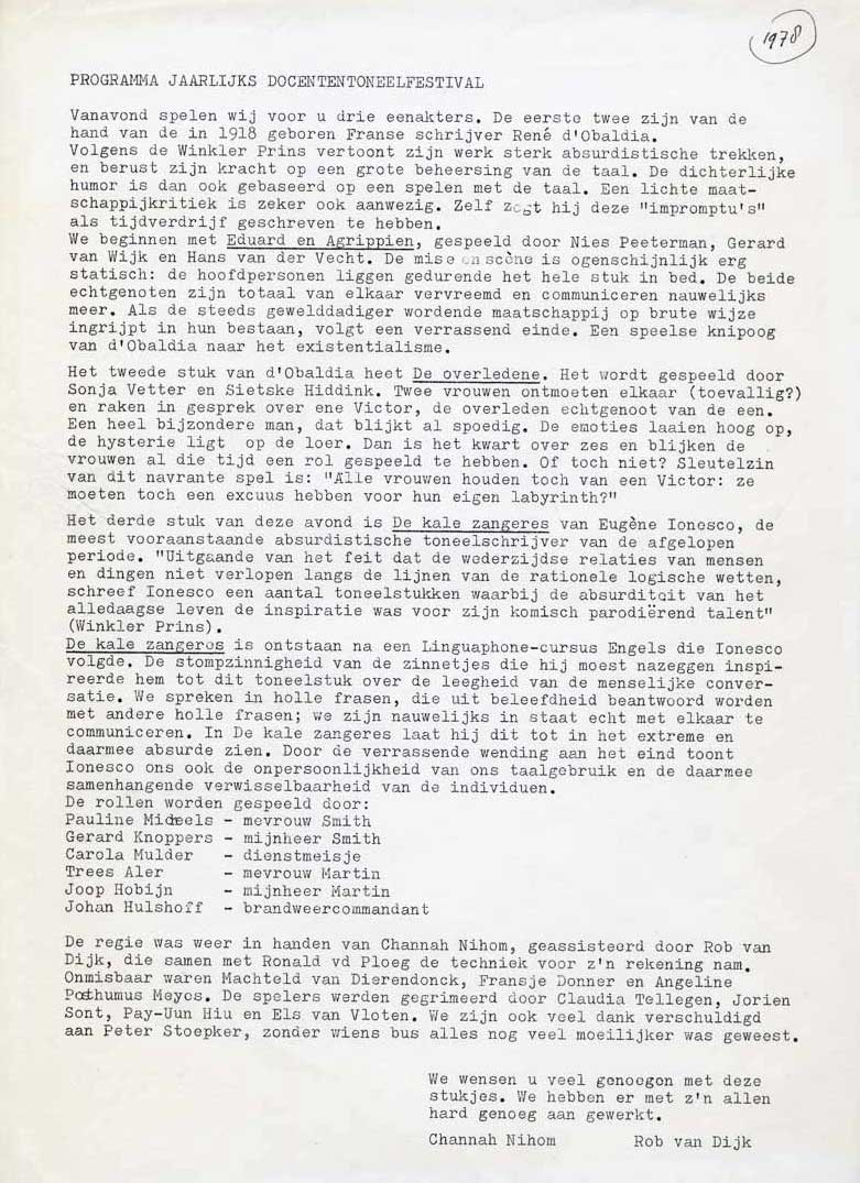 Langzamerhand werd docententoneel een traditie. In 1978 speelden we drie eenacters. Eduard en Agrippien en De kale zangeres werden ook voor de leerlingen opgevoerd.